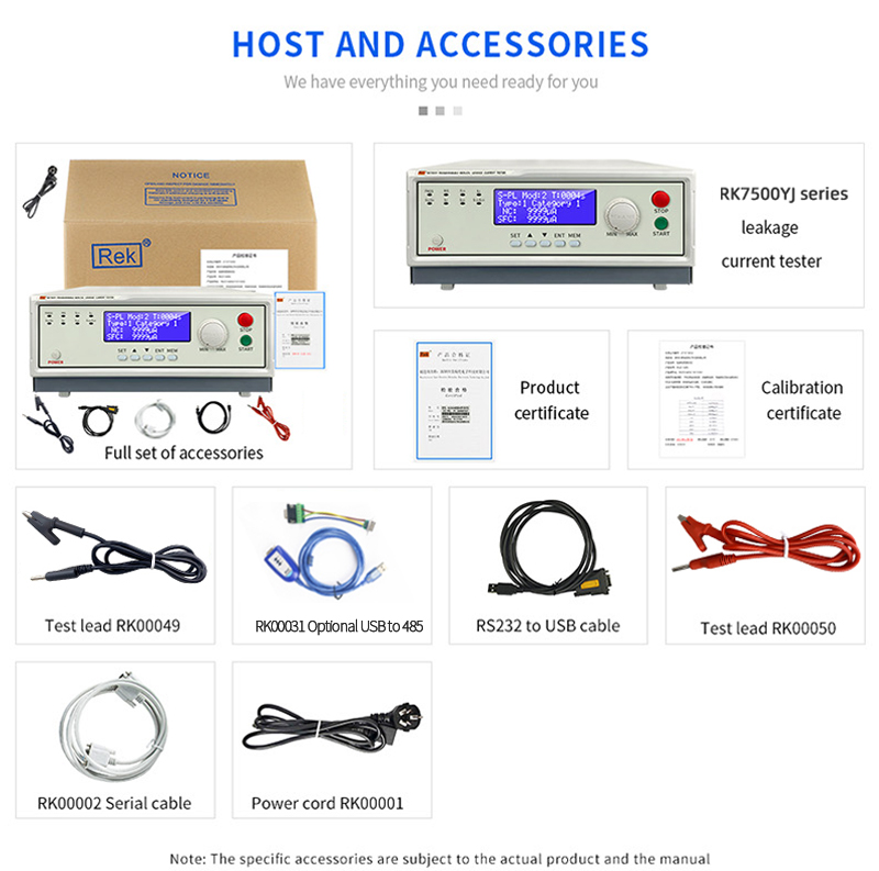 | Optional standard accessories | Power cord RK00001 (applicable to RK7505Y RK7510YJ), RS232 communication cable RK0002, RS232-to-USB cable RK00003, test cord RK00072/RK00073, quick operation guide, RK00018 power cord (applicable to RK7520YRK7530YRK7550YJ-2) | |||||